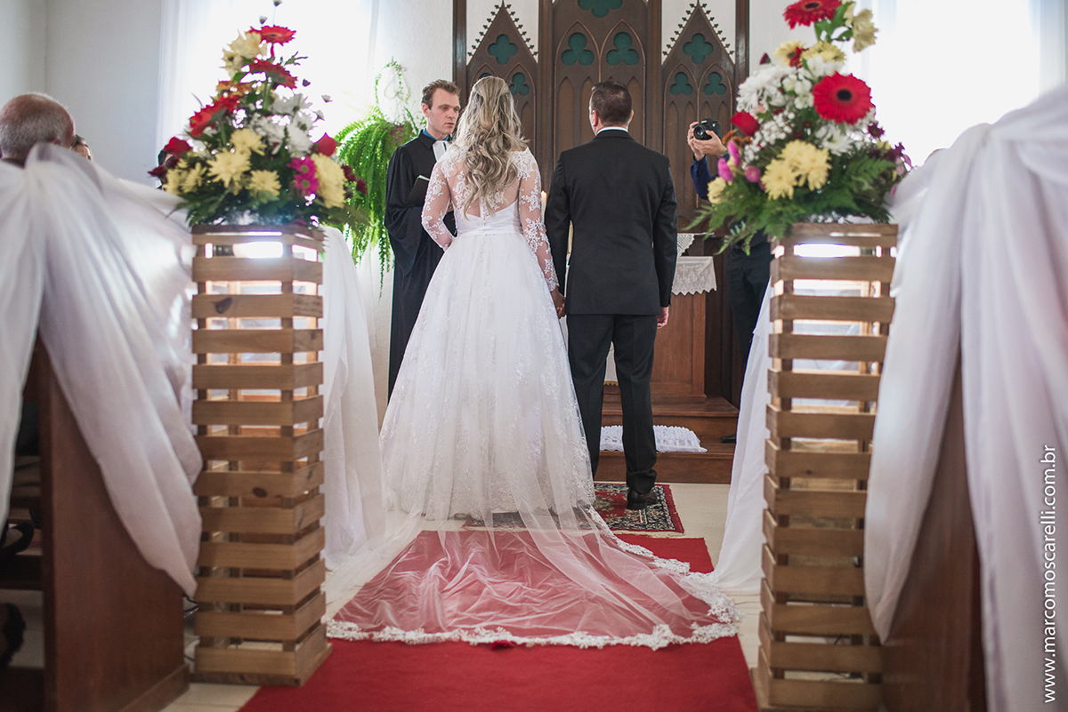 Foto do casal de noivos no altar com a nave da igreja de fundo. Foto por Marco Moscarelli