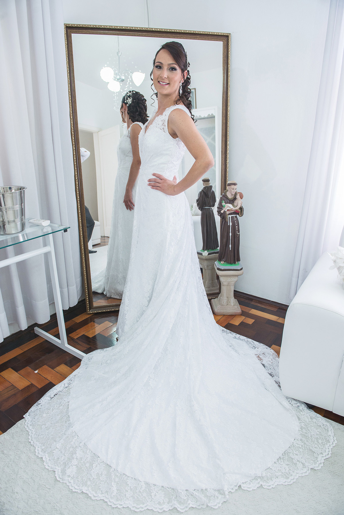 Noiva conferindo o vestido na frente do espelho antes da cerimônia de casamento.