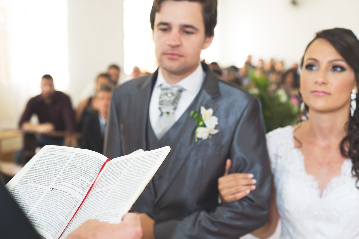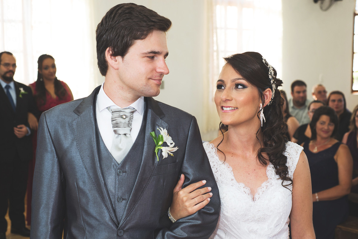 Noiva dando um olhar singelo para o noivo no momento da cerimônia de casamento.