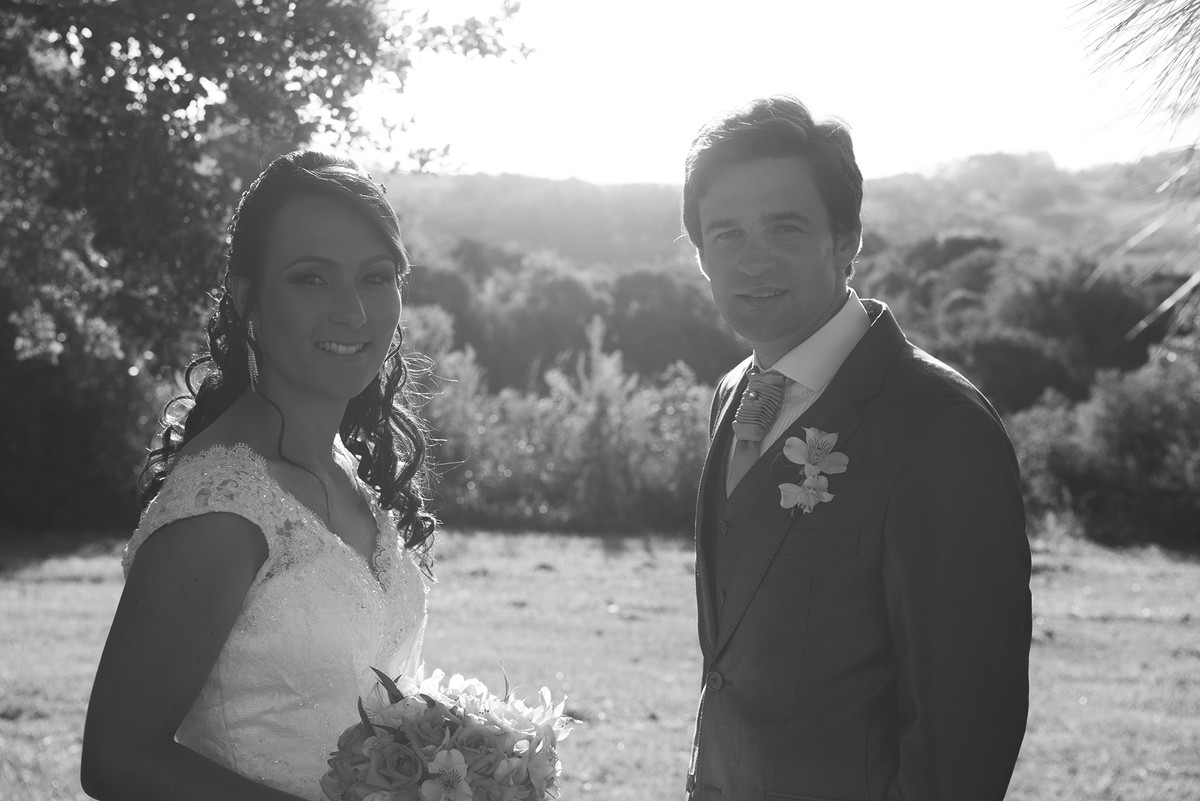Foto contra a luz do casal de noivos.