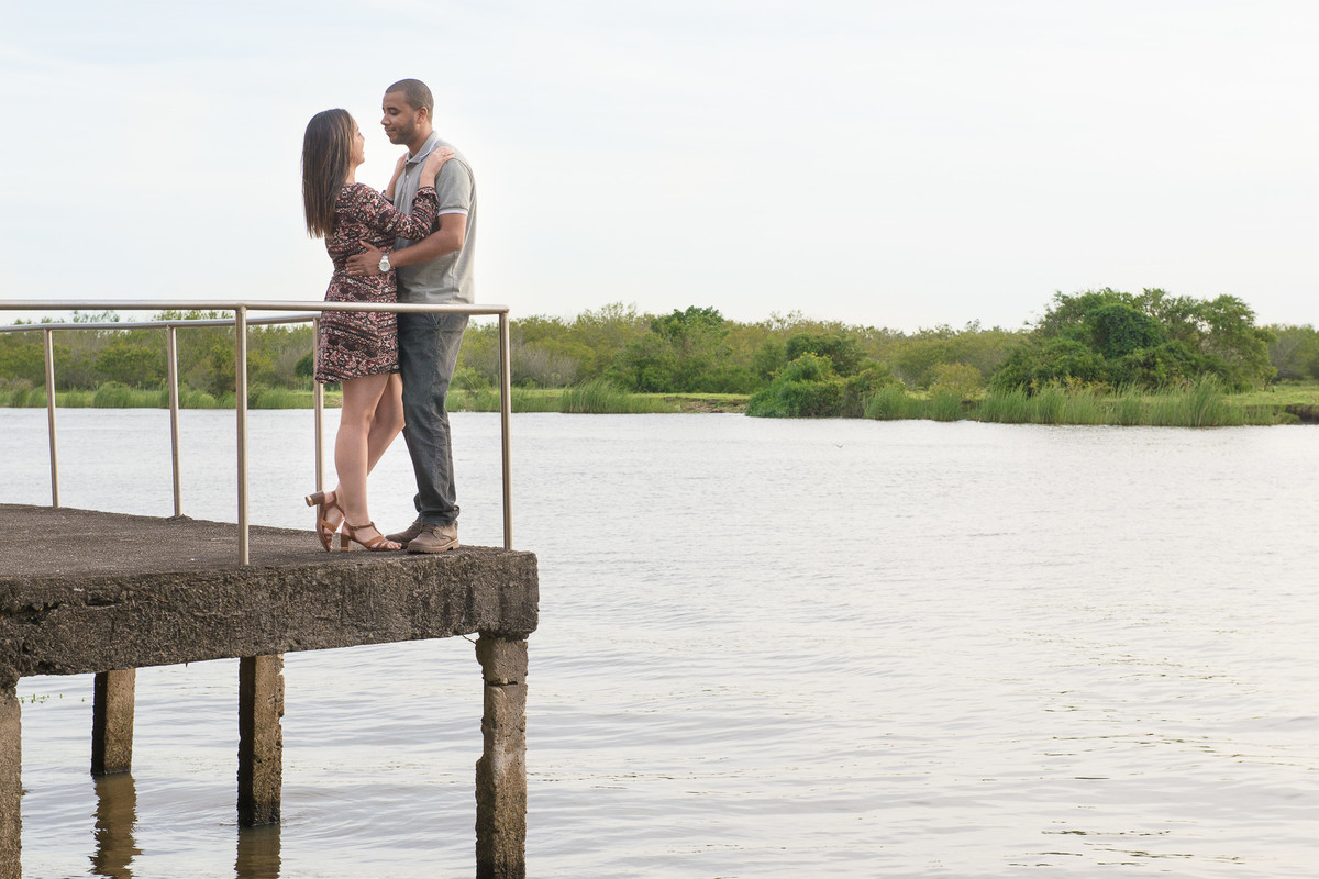 Noivo fazendo carinho no rosto da noiva durante o ensaio pré casamento do casal.