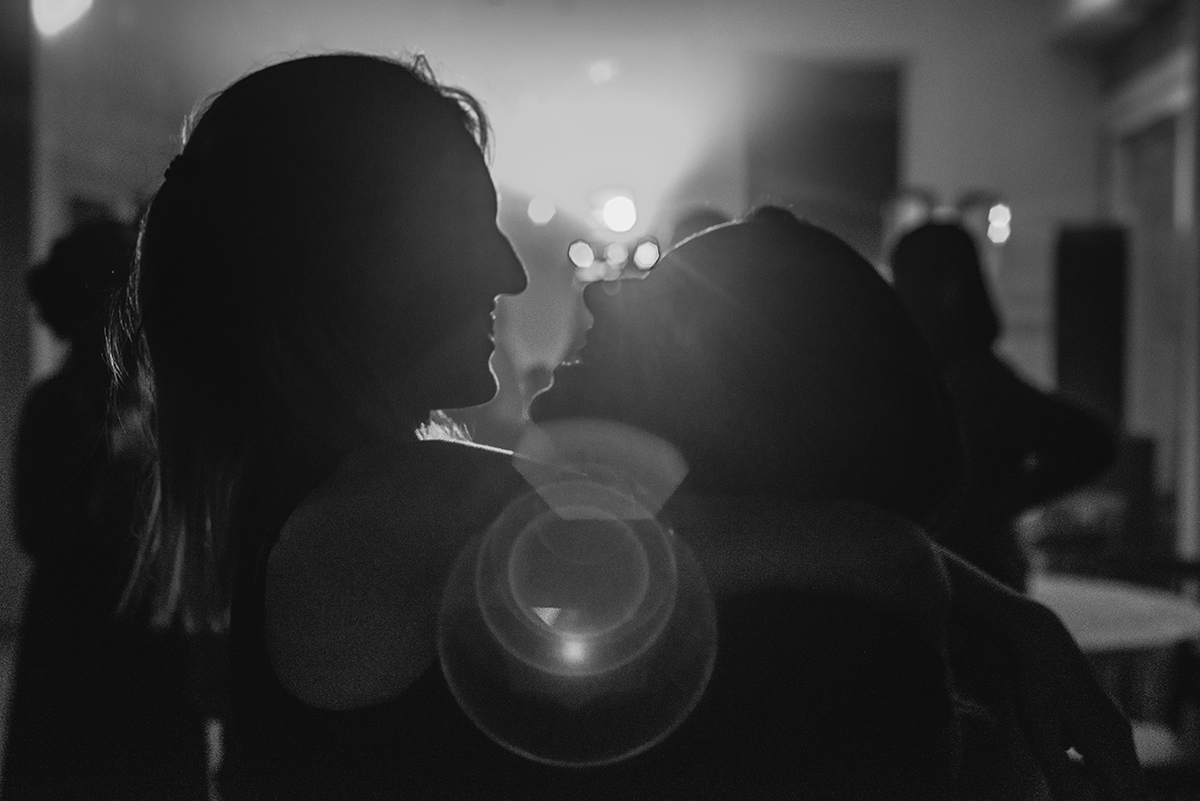 Fotografia em preto e branco de uma convidada da recepção de formatura. Foto por Marco Moscarelli